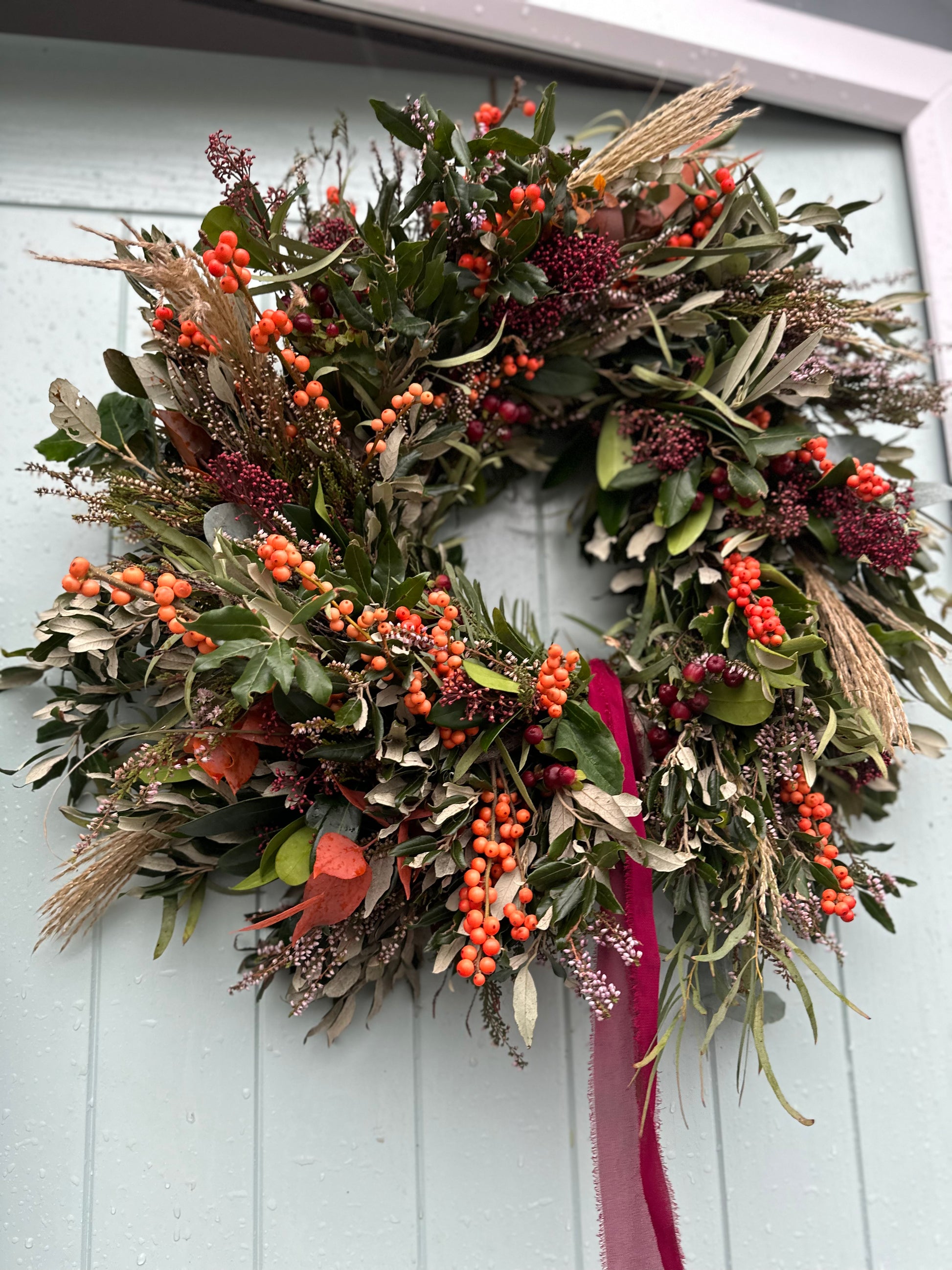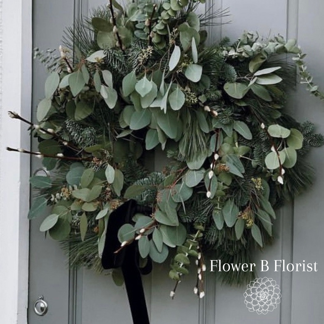 A beautiful fresh door wreath handmade on a natural moss base using a selection of festive foliage, decorated to your choice finished with a luxury bow.