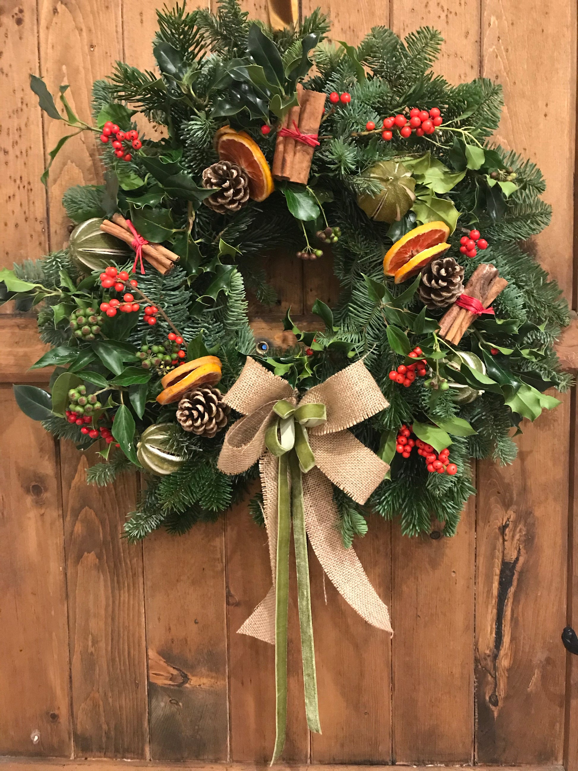 Get into the festive spirit by making your very own festive door wreath in the comfort of your own home. This DIY kit includes everything you need to create a beautiful fresh foliage wreath decorated with dried fruits, pine cones, cinnamon sticks and a festive bow.
