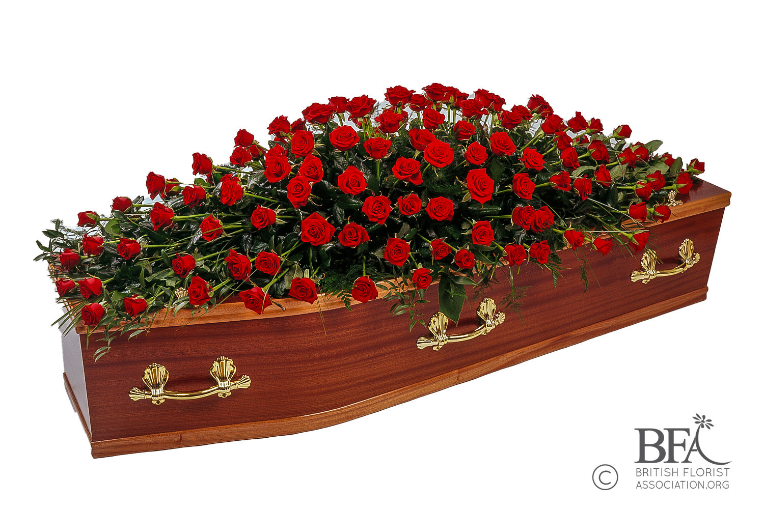 A classic red rose tribute coffin spray, available in a range of sizes.