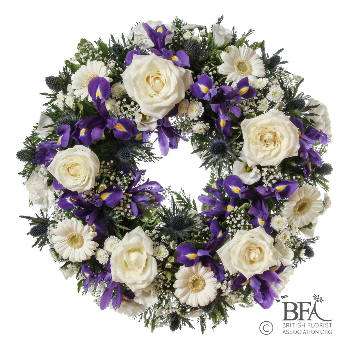 A classic traditional blue and white wreath tribute including roses, iris, gerbera and chrysanthemums, available in a range of sizes.